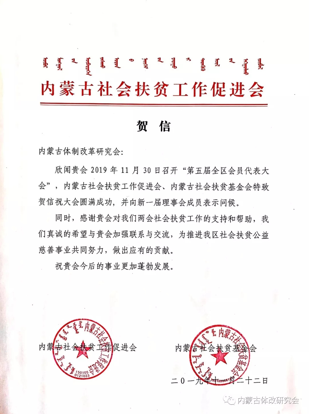 內(nèi)蒙古社會(huì)扶貧工作促進(jìn)會(huì)、內(nèi)蒙古社會(huì)扶貧基金會(huì)發(fā)來賀信