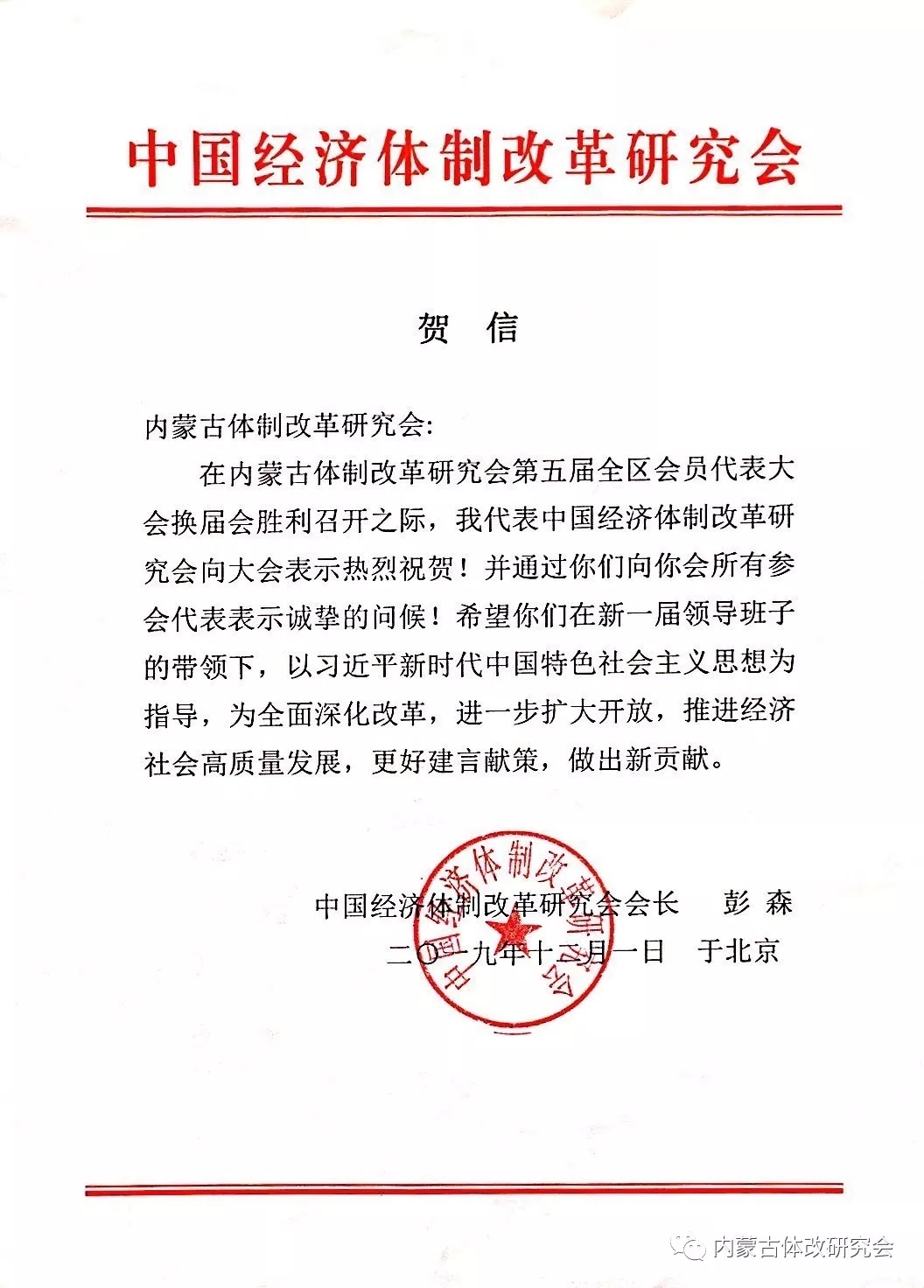 中國體制改革研究會(huì)發(fā)來賀信