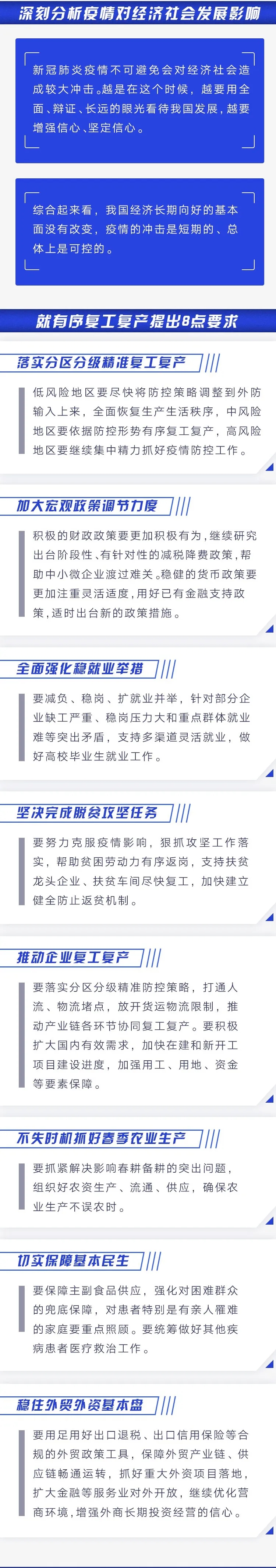 習(xí)近平指出,新冠肺炎疫情不可避免會(huì)對(duì)經(jīng)濟(jì)社會(huì)造成較大沖擊。越是在這個(gè)時(shí)候,越要用全面、辯證、長(zhǎng)遠(yuǎn)的眼光看待我國(guó)發(fā)展,越要增強(qiáng)信心、堅(jiān)定信心。綜合起來看,我國(guó)經(jīng)濟(jì)長(zhǎng)期向好的基本面沒有改變,疫情的沖擊是短期的、總體上是可控的。習(xí)近平就有序復(fù)工復(fù)產(chǎn)提出8點(diǎn)要求。第一,落實(shí)分區(qū)分級(jí)精準(zhǔn)復(fù)工復(fù)產(chǎn)。低風(fēng)險(xiǎn)地區(qū)要盡快將防控策略調(diào)整到外防輸入上來,全面恢復(fù)生產(chǎn)生活秩序,中風(fēng)險(xiǎn)地區(qū)要依據(jù)防控形勢(shì)有序復(fù)工復(fù)產(chǎn),高風(fēng)險(xiǎn)地區(qū)要繼續(xù)集中精力抓好疫情防控工作。第二,加大宏觀政策調(diào)節(jié)力度。積極的財(cái)政政策要更加積極有為,繼續(xù)研究出臺(tái)階段性、有針對(duì)性的減稅降費(fèi)政策,幫助中小微企業(yè)渡過難關(guān)。穩(wěn)健的貨幣政策要更加注重靈活適度,用好已有金融支持政策,適時(shí)出臺(tái)新的政策措施。第三,全面強(qiáng)化穩(wěn)就業(yè)舉措。要減負(fù)、穩(wěn)崗、擴(kuò)就業(yè)并舉,針對(duì)部分企業(yè)缺工嚴(yán)重、穩(wěn)崗壓力大和重點(diǎn)群體就業(yè)難等突出矛盾,支持多渠道靈活就業(yè),做好高校畢業(yè)生就業(yè)工作。第四,堅(jiān)決完成脫貧攻堅(jiān)任務(wù)。要努力克服疫情影響,狠抓攻堅(jiān)工作落實(shí),幫助貧困勞動(dòng)力有序返崗,支持扶貧龍頭企業(yè)、扶貧車間盡快復(fù)工,加快建立健全防止返貧機(jī)制。第五,推動(dòng)企業(yè)復(fù)工復(fù)產(chǎn)。要落實(shí)分區(qū)分級(jí)精準(zhǔn)防控策略,打通人流、物流堵點(diǎn),放開貨運(yùn)物流限制,推動(dòng)產(chǎn)業(yè)鏈各環(huán)節(jié)協(xié)同復(fù)工復(fù)產(chǎn)。要積極擴(kuò)大國(guó)內(nèi)有效需求,加快在建和新開工項(xiàng)目建設(shè)進(jìn)度,加強(qiáng)用工、用地、資金等要素保障。第六,不失時(shí)機(jī)抓好春季農(nóng)業(yè)生產(chǎn)。要抓緊解決影響春耕備耕的突出問題,組織好農(nóng)資生產(chǎn)、流通、供應(yīng),確保農(nóng)業(yè)生產(chǎn)不誤農(nóng)時(shí)。第七,切實(shí)保障基本民生。要保障主副食品供應(yīng),強(qiáng)化對(duì)困難群眾的兜底保障,對(duì)患者特別是有親人罹難的家庭要重點(diǎn)照顧。要統(tǒng)籌做好其他疾病患者醫(yī)療救治工作。第八,穩(wěn)住外貿(mào)外資基本盤。要用足用好出口退稅、出口信用保險(xiǎn)等合規(guī)的外貿(mào)政策工具,保障外貿(mào)產(chǎn)業(yè)鏈、供應(yīng)鏈暢通運(yùn)轉(zhuǎn),抓好重大外資項(xiàng)目落地,擴(kuò)大金融等服務(wù)業(yè)對(duì)外開放,繼續(xù)優(yōu)化營(yíng)商環(huán)境,增強(qiáng)外商長(zhǎng)期投資經(jīng)營(yíng)的信心。
