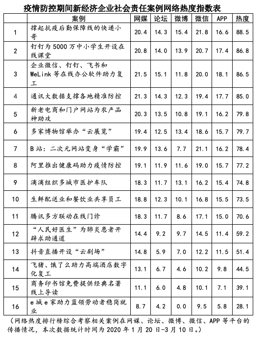 課題組考察在統(tǒng)籌推進(jìn)疫情防控和經(jīng)濟(jì)社會秩序恢復(fù)中表現(xiàn)突出的互聯(lián)網(wǎng)平臺案例,根據(jù)其對經(jīng)濟(jì)社會生活的實際影響,以及公眾對相關(guān)服務(wù)的關(guān)注度和美譽度,由長期研究互聯(lián)網(wǎng)新經(jīng)濟(jì)的專家學(xué)者推薦產(chǎn)生“疫情防控期間互聯(lián)網(wǎng)企業(yè)社會責(zé)任案例”。新經(jīng)濟(jì)是一個開放的賽道,在服務(wù)公眾的賽道上應(yīng)鼓勵萬馬奔騰。本次案例推薦不僅重視BAT等超級平臺,也適當(dāng)選入一些中小微互聯(lián)網(wǎng)企業(yè),點贊其服務(wù)經(jīng)濟(jì)民生的創(chuàng)新嘗試。