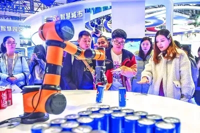 參觀者在北京一場(chǎng)5G大會(huì)上控制機(jī)械臂抓取飲料,體驗(yàn)“隔空取物”