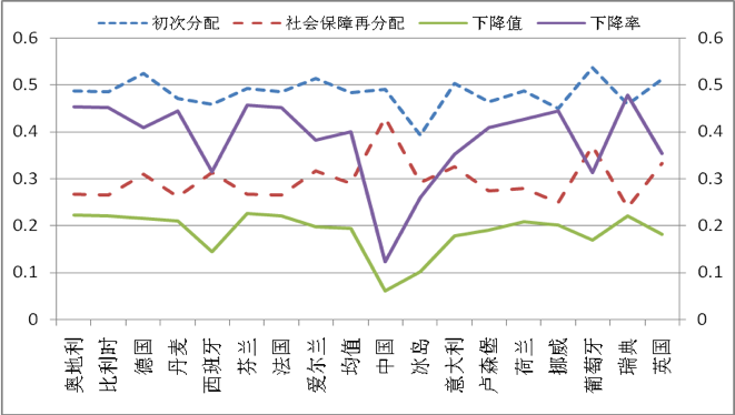 我國社會保障制度在平抑一次分配差距方面還遠沒有發(fā)揮應有的作用。據(jù)北師大收入分配研究院2017年的一項研究,18個歐盟國家市場收入的基尼系數(shù)為0.443,在社會保障的作用下,這些國家的可支配收入基尼系數(shù)降為0.29。從下降幅度來看,歐盟國家政府的社會保障政策使得其基尼系數(shù)的平均值下降了40%,相比之下,中國僅下降了12.3%。