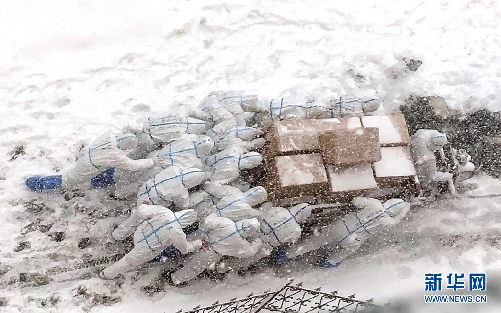 漫天飛雪的路上,十幾個(gè)人推著一輛滿載貨物的三輪車艱難前行,數(shù)次滑倒又爬起后,身上的防護(hù)服仿佛與天地融為一體……