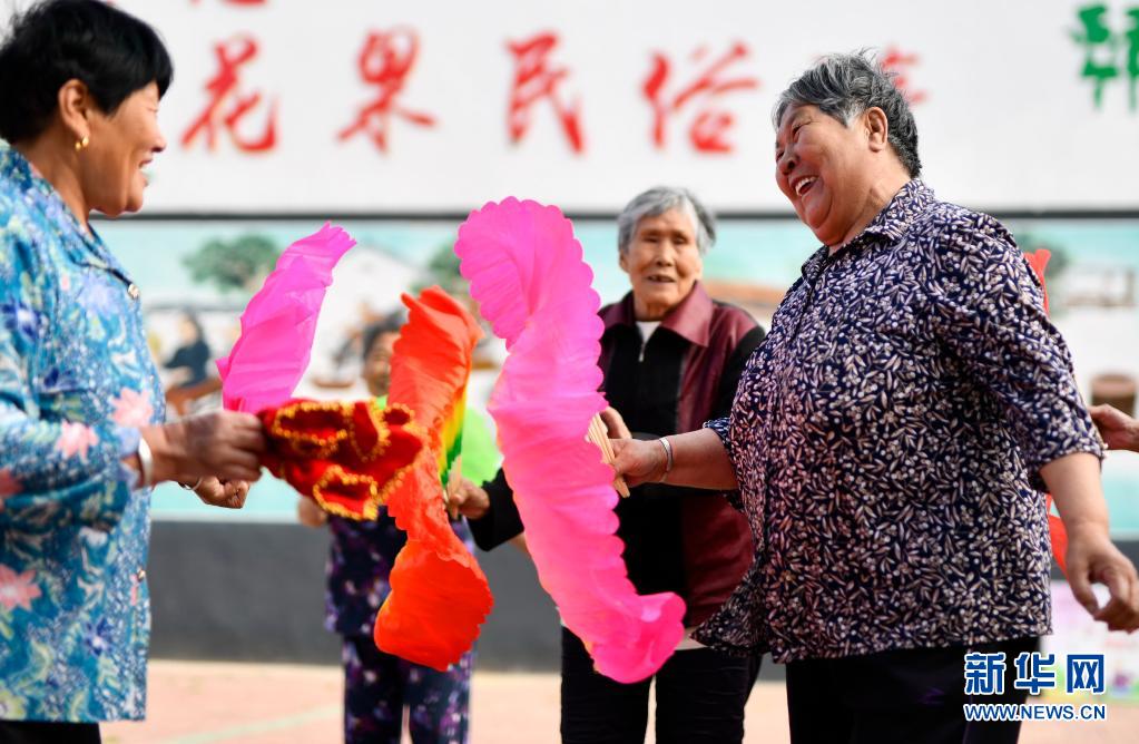居住在河北省灤州市灤城街道花果莊村福興老年公寓的老人們在扭秧歌(2021年6月1日攝)。新華社記者 牟宇 攝