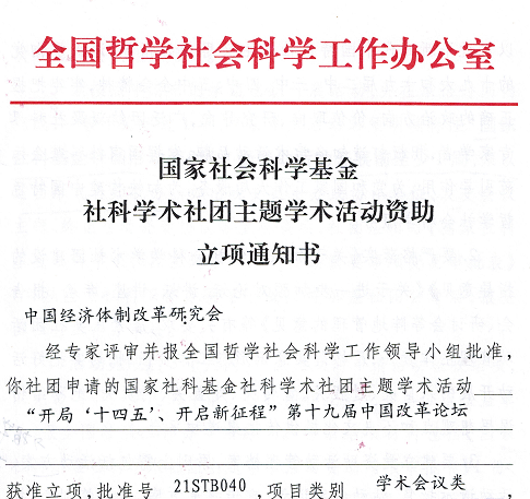根據(jù)全國哲學(xué)社會科學(xué)工作辦公室發(fā)布的“2021年國家社科基金社科學(xué)術(shù)社團(tuán)主題學(xué)術(shù)活動資助名單” ,我會以 “開局‘十四五’、開啟新征程”為主題的第十九屆中國改革論壇獲得國家社科基金立項(xiàng)資助。這是繼今年3月份我會《推進(jìn)土地、勞動力、資本、技術(shù)、數(shù)據(jù)等要素市場化改革研究》課題獲得國家社科基金重大項(xiàng)目立項(xiàng)后,兩年內(nèi)第四次獲得國家社科基金資助(獎勵)。