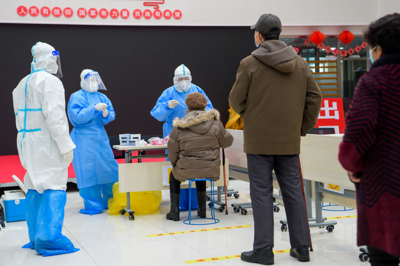 在內(nèi)蒙古滿洲里市東山街道辦事處怡園社區(qū)府欣小區(qū)A區(qū)核酸采樣點(diǎn),工作人員為居民做核酸采樣(2021年11月29日攝)。新華社記者 李志鵬 攝