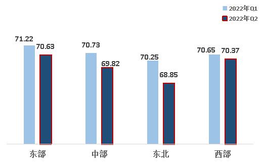 2、從區(qū)域來(lái)看,西部地區(qū)熱度指數(shù)超越中部地區(qū)。東部、西部、中部、東北指數(shù)分別為70.63、70.37、69.82、68.85。區(qū)域熱度指數(shù)呈地域特征,東部地區(qū)第一,西部地區(qū)超越中部地區(qū)名列第二,東北地區(qū)最后。四大區(qū)域均比上一季度有所下滑,其中,東北、中部地區(qū)指數(shù)降幅較大。