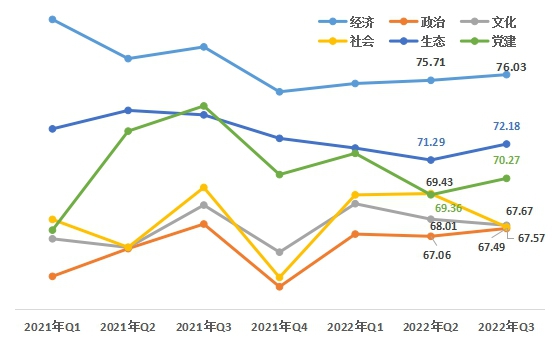 1、生態(tài)、黨建領(lǐng)域上升。從六大領(lǐng)域來看,經(jīng)濟領(lǐng)域76.03,政治領(lǐng)域67.49 ,文化領(lǐng)域67.67,社會領(lǐng)域67.57,生態(tài)領(lǐng)域72.18,黨建領(lǐng)域70.27。與上一季度相比,經(jīng)濟、政治、生態(tài)、黨建領(lǐng)域均有上升,文化、社會領(lǐng)域略有下降。