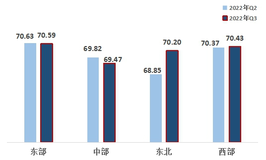 2、從區(qū)域來看,東北、西部地區(qū)均超越中部地區(qū)。東部、西部、東北、中部指數(shù)分別為70.59、70.43、70.20、69.47。區(qū)域熱度指數(shù)呈適當?shù)牡赜蛱卣?,東部地區(qū)第一,西部地區(qū)第二,東北地區(qū)超越中部地區(qū)名列第三,中部地區(qū)最后。東北地區(qū)指數(shù)增幅較大,西部地區(qū)有所增長,東部、中部地區(qū)小幅下滑。