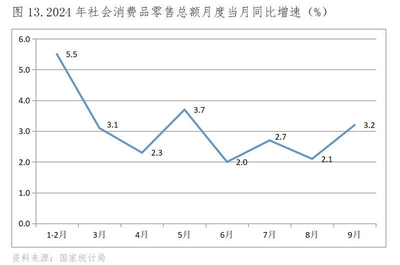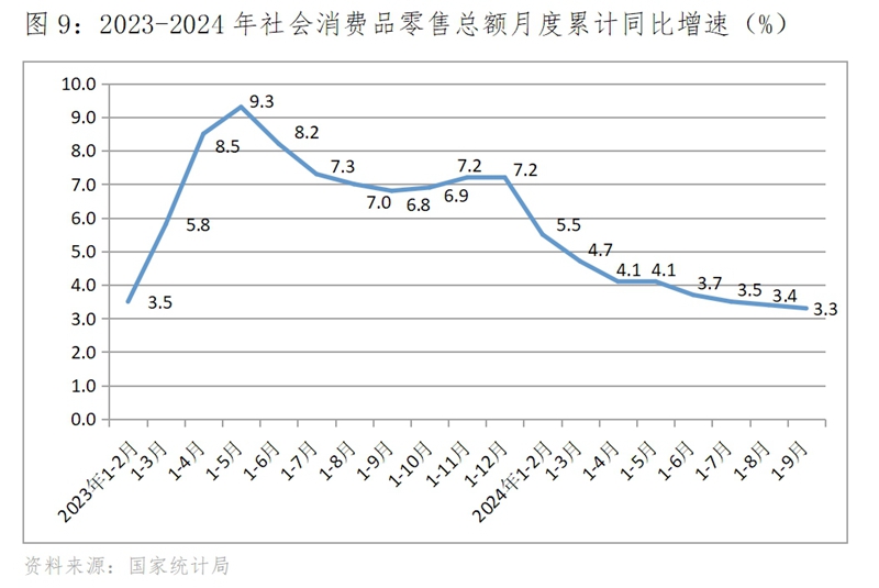 (三)零售增速總體呈現(xiàn)低速波動(dòng)回落,9月份回升。1-2月份社會(huì)消費(fèi)品零售總額同比增長5.5%,為今年以來的最快增速,3月份回落到增長3.1%,此后增速在2.0-4.0%區(qū)間內(nèi)低速波動(dòng),9月份增速回升,增長3.2%。