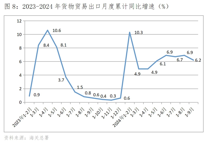 (五)出口增速在較大波動(dòng)中出現(xiàn)放緩,9月份回落。今年以來的出口增速波動(dòng)還不小,1-2月份出口同比增長10.3%,3月份下降3.8%,隨后保持了兩個(gè)月增速的回升,自6月份增速開始波動(dòng)回落,到9月份回落到增長1.6%。
