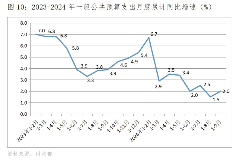 (四)財(cái)政支出增速在低速波動(dòng)中走低,9月份略有回升。財(cái)政支出增速年初也是高開,1-2月份財(cái)政支出同比增長6.7%,1-3月份回落到增長2.9%,隨后就在低速波動(dòng)中趨勢性回落,1-9月份增長2.0%。需要特別指出的是,如果按月度增速計(jì)算的話,財(cái)政支出增速波動(dòng)會(huì)更大一些。