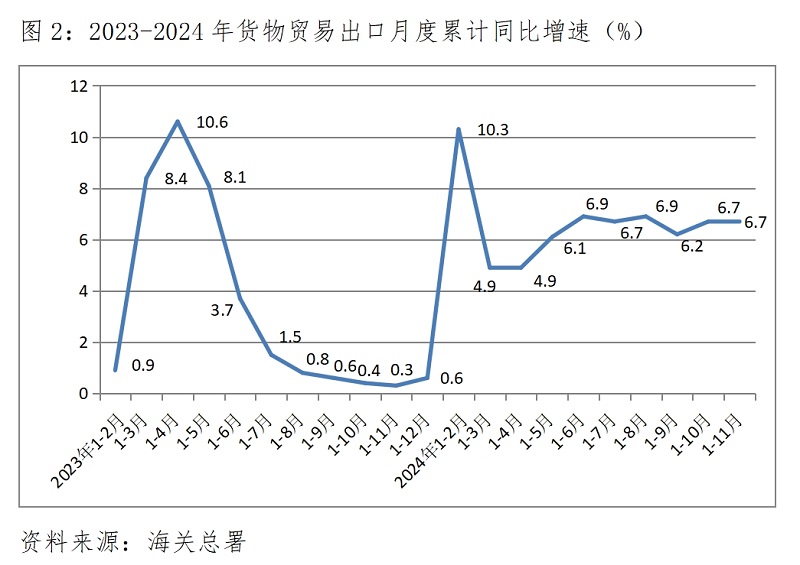 (二)貨物出口增速由升轉(zhuǎn)平。1-11月份,貨物出口同比增長6.7%,與1-10月份增速持平,1-10月份增速比1-9月份增速6.2%回升0.5個(gè)百分點(diǎn)。對(duì)歐盟、美國和東盟等貨物出口增速全面回升,1-11月份對(duì)歐盟出口增長3.8%,比1-10月份回升0.3個(gè)百分點(diǎn);對(duì)美國出口增長5.1%,比1-10月份回升0.2個(gè)百分點(diǎn);對(duì)東盟出口增長12.7%,比1-10月份回升0.2個(gè)百分點(diǎn);但對(duì)拉丁美洲出口增長14.1%,比1-10月份回落0.4個(gè)百分點(diǎn)。