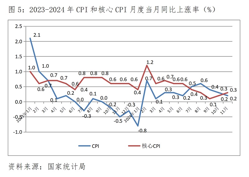 (三) CPI漲幅繼續(xù)小幅回落。11月份,CPI同比上漲0.2%,比10月份上漲0.3%回落了0.1個(gè)百分點(diǎn),而10月份漲幅比9月份漲幅回落0.1個(gè)百分點(diǎn),延續(xù)了上月漲幅回落的態(tài)勢。其中食品價(jià)格上漲1.0%,比上月上漲2.9%回落1.9個(gè)百分點(diǎn);非食品價(jià)格持平,上月為下降0.3%。11月份,核心CPI同比上漲0.3%,比10月份上漲0.2%回升了0.1個(gè)百分點(diǎn)。CPI和核心CPI漲幅都仍還比較低,說明市場需求仍還較為疲弱。