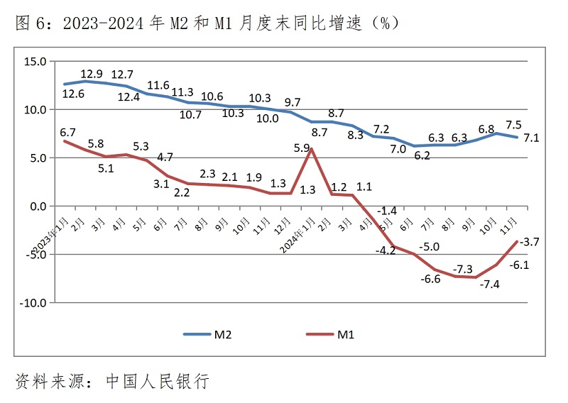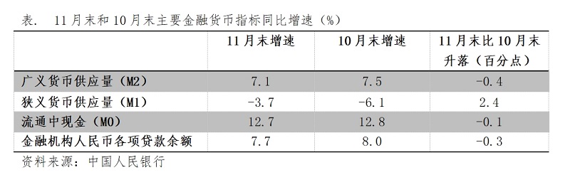 (四)M2增速由升轉(zhuǎn)落。11月末,廣義貨幣供應(yīng)量(M2)同比增長7.1%,比10月末增長7.5%回落0.4個(gè)百分點(diǎn),10月末增速比9月末增速回升0.7個(gè)百分點(diǎn);狹義貨幣供應(yīng)量(M1)降幅繼續(xù)縮小,11月末同比下降3.7%,比10月末同比下降6.1%縮小2.4個(gè)百分點(diǎn),10月末降幅比9月末降幅縮小1.3個(gè)百分點(diǎn);流通中貨幣(M0)增速由升轉(zhuǎn)落,11月末同比增長12.7%,比10月末增長12.8%回落0.1介百分點(diǎn),10月末增速比9月末增速回升了1.3個(gè)百分點(diǎn)。各層次貨幣供應(yīng)量又出現(xiàn)了不同方向的變化走勢。