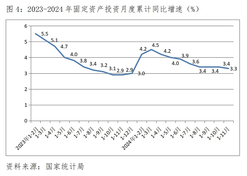 (二)投資增速由持平轉(zhuǎn)小幅回落。1-11月份,固定資產(chǎn)投資同比增長3.3%,與1-10月份增長3.4%回落0.1個(gè)百分點(diǎn),1-10月份增速與1-9月份持平,投資增速在保持連續(xù)3個(gè)月持平后出現(xiàn)了小幅回落。國有控股投資增速略有回落,1-11月份比1-10月份回落0.1個(gè)百分點(diǎn);民間投資降幅略有擴(kuò)大,1-11月份比1-10月份擴(kuò)大0.1個(gè)百分點(diǎn)。三次產(chǎn)業(yè)投資中,第一產(chǎn)業(yè)投資增速回落0.1個(gè)百分點(diǎn),第二產(chǎn)業(yè)投資增速回落0.2個(gè)百分點(diǎn),第三產(chǎn)業(yè)投資降幅擴(kuò)大0.1個(gè)百分點(diǎn)。