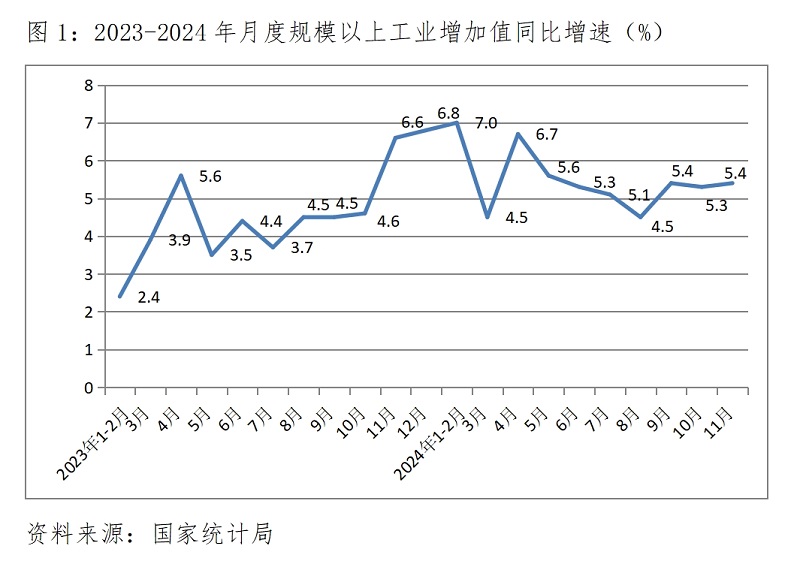 (一)工業(yè)增速由落轉(zhuǎn)升。11月份,規(guī)模以上工業(yè)增加值同比增長5.4%,比10月份增長5.3%回升了0.1個(gè)百分點(diǎn),10月份增速比9月份增速5.4%回落了0.1個(gè)百分點(diǎn)。其中,制造業(yè)同比增長6.0%,比上月回升0.6個(gè)百分點(diǎn);國有控股企業(yè)增長3.9%,回升0.1個(gè)百分點(diǎn);私營企業(yè)增長4.5%,回落0.3個(gè)百分點(diǎn)。