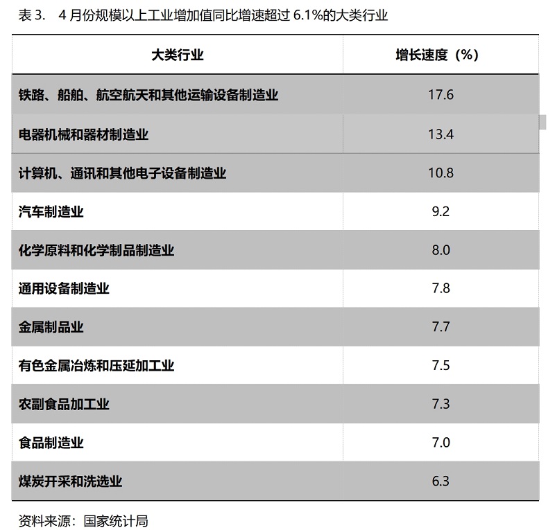 4月份,增長速度超過規(guī)模以上工業(yè)增長6.1%的主要大類行業(yè)共有11個,即鐵路、船舶、航空航天和其他運輸設備制造業(yè)增長17.6%,電器機械和器材制造業(yè)增長13.4%,計算機、通訊和其他電子設備制造業(yè)增長10.8%,汽車制造業(yè)增長9.2%,化學原料和化學制品制造業(yè)增長8.0%,通用設備制造業(yè)增長7.8%,金屬制品業(yè)增長7.7%,有色金屬冶煉和壓延加工業(yè)增長7.5%,農(nóng)副食品加工業(yè)增長7.3%,食品制造業(yè)增長7.0%,煤炭開采和洗選業(yè)增長6.3%。