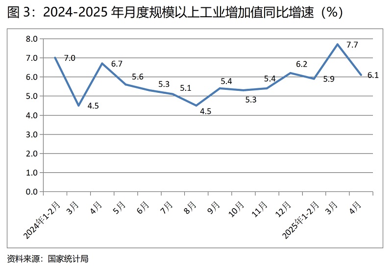 (三)工業(yè)增速由升轉(zhuǎn)落。4月份,規(guī)模以上工業(yè)增加值同比增長6.1%,比上月增長7.7%回落了1.6個百分點,3月份比1-2月份回升了1.8個百分點。4月份工業(yè)增速出現(xiàn)回落,有上年同期高基數(shù)的因素,上年4月份增長6.7%,如按兩年平均計算,增速為6.4%。從工業(yè)三大門類看,回落最多的是采礦業(yè),4月份比3月份回落了3.6個百分點,電力、熱力、燃氣及水生產(chǎn)和供應業(yè)回落了1.4個百分點,制造業(yè)回落了1.3個百分點。