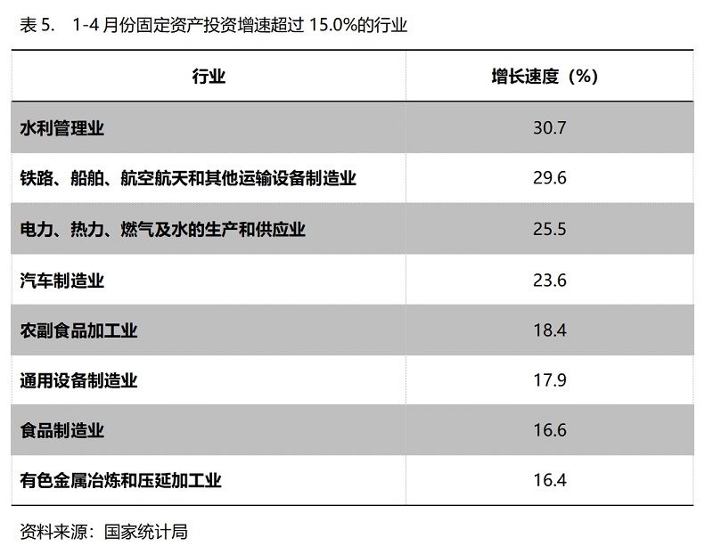 1-4月份,固定資產(chǎn)投資增速超過15%的主要行業(yè)共8個,即水利管理業(yè)增長30.7%,鐵路、船舶、航空航天和其他運輸設備制造業(yè)增長29.6%,電力、熱力、燃氣及水的生產(chǎn)和供應業(yè)增長25.5%,汽車制造業(yè)增長23.6%,農(nóng)副食品加工業(yè)增長18.4%,通用設備制造業(yè)增長17.9%,食品制造業(yè)增長16.6%,有色金屬冶煉和壓延加工業(yè)增長16.4%。