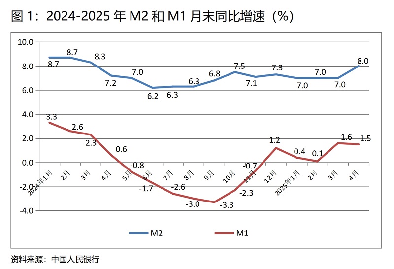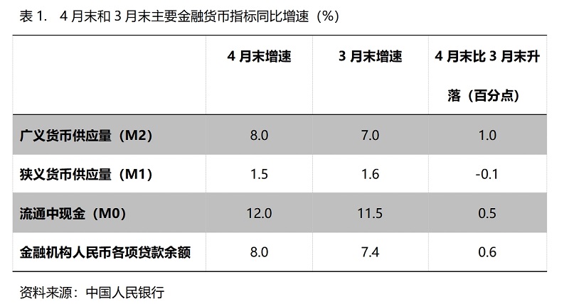 (一)M2增速由平轉(zhuǎn)升。4月末,廣義貨幣供應量(M2)同比增長8.0%,比3月末增長7.0%回升1.0個百分點,實際上這是在今年前三個月末連續(xù)保持7.0%增速基礎上的回升;狹義貨幣供應量(M1)增速比上月略有回落,4月末同比增長1.5%,比3月末增長1.6%回落0.1個百分點,而3月末增幅比2月末增幅回升1.5個百分點;流通中貨幣(M0)增速由升轉(zhuǎn)落,4月末同比增長12.0%,比3月末增長11.5%回升0.5個百分點,而3月末增速比2月末增速回升了1.8個百分點。貨幣政策正按照適度寬松的要求運行,這對推動經(jīng)濟回升將發(fā)揮積極作用,但各層次貨幣供應量增速較大差異反映出的問題需引起關注。
