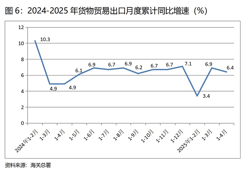 (六)貨物出口增速由升轉(zhuǎn)落。1-4月份,貨物出口同比增長6.4%,比1-3月份增長6.9%回落0.5個百分點,1-3月份比1-2月份回升3.5個百分點,增速呈現(xiàn)出由升轉(zhuǎn)落的態(tài)勢。貨物出口對主要貿(mào)易出口經(jīng)濟體增速有平有落也有升,1-4月份對歐盟出口同比增長4.9%,與1-3月份4.9%的增速持平;對美國出口下降2.5%,1-3月份增長5.6%,增速由增長轉(zhuǎn)為下降;對東盟出口增長11.5%,比1-3月份增長9.2%回升2.3個百分點;對拉丁美洲出口增長11.5%,比1-3月份增長10.7%回升0.8個百分點。在美國濫用關稅政策、對美國出口出現(xiàn)下降的情況下,我國出口仍能保持較快增長,特別是對一些主要經(jīng)濟體增長呈現(xiàn)加快的勢頭,充分說明我國出口不僅有較強的競爭力,也有較強的韌性。