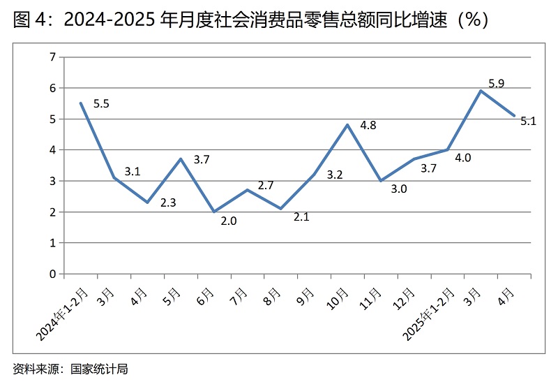 (四)零售增速由升轉(zhuǎn)落。4月份,社會消費品零售總額同比增長5.1%,比3月份增長5.8%回落了0.7個百分點,3月份比1-2月份增長4.0%回升了1.9個百分點。4月份社會消費品零售總額增速的回落,盡管有汽車及其油價下降的因素,但應看到這是在上年同期基數(shù)較低基礎上的回落,說明消費需求不足的問題仍還比較突出,在面對較大不確定性的國際局勢,研究謀劃更加有效的擴大消費特別是服務消費的政策措施顯得十分重要。