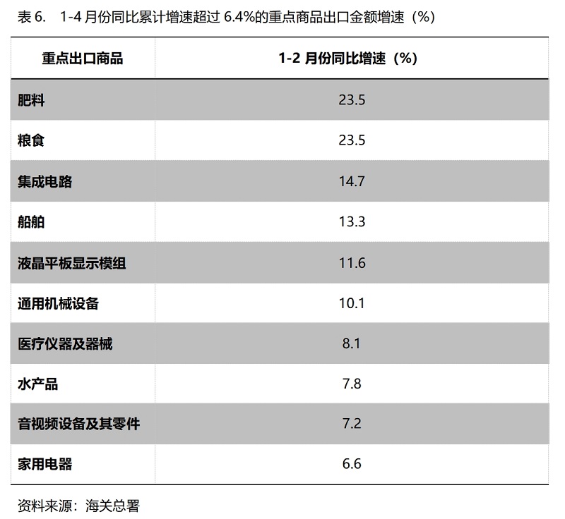 1-4月份,出口金額同比增速超過6.4%的重點商品共有10類,即肥料出口增長23.5%,糧食增長23.5%,集成電路增長14.7%,船舶增長13.3%,液晶平板顯示模組增長11.6%,通用機器設備增長10.1%,醫(yī)療儀器及器械增長8.1%,水產(chǎn)品增長7.8%,音視頻設備及其零件增長7.2%,家用電器增長6.6%。