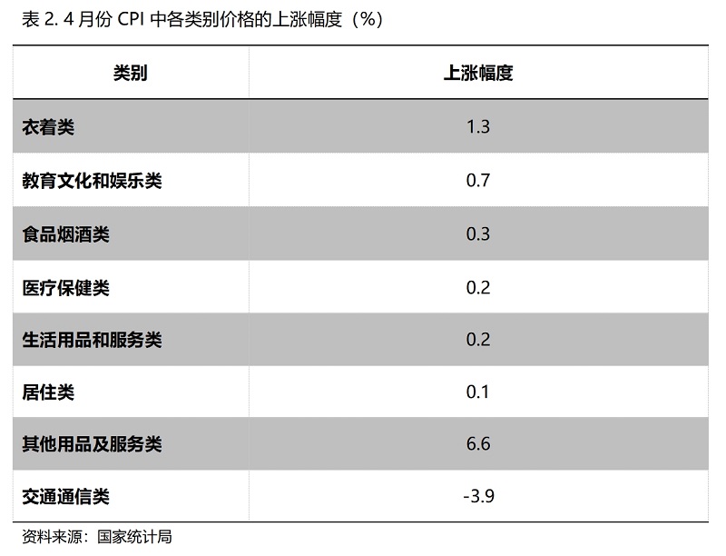 4月份,在CPI 8個類別中有7個類別保持上漲,1個類別下降。上漲的7個類別包括衣著類價格同比上漲1.3%,教育文化和娛樂類上漲0.7%,食品煙酒類上漲0.3%,醫(yī)療保健類上漲0.2%,生活用品及服務類上漲0.2%,居住類上漲0.1%,其他用品和服務類上漲6.6%;下降的雖然就交通通信類1個類別,但降幅較大,4月份同比下降3.9%。