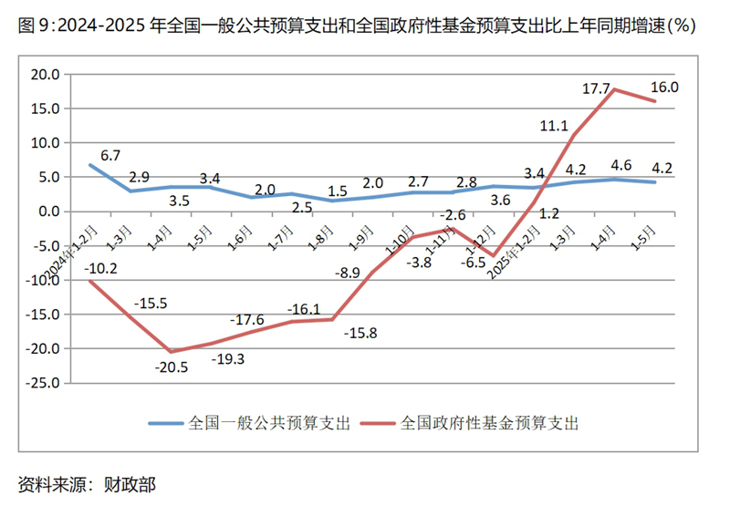 (四)一般公共預(yù)算支出增速與一季度持平、比上年同期回升,政府性基金預(yù)算支出增速比一季度回升、由上年同期下降轉(zhuǎn)為增長。1-5月份全國一般公共預(yù)算支出同比增長4.2%,與一季度增長4.2%持平,比上年同期增長3.4%回升了0.8個百分點(diǎn),但增速仍有一些偏慢;全國政府性基金預(yù)算支出同比增長16.0%,比一季度增長11.1%回升4.9個百分點(diǎn),上年同期為下降19.3%,呈現(xiàn)出明顯回升的態(tài)勢。從拉動經(jīng)濟(jì)增長的要求看,特別是在面對微觀經(jīng)營主體需求不足的形勢下,政府支出還需要更快一些,有必要進(jìn)一步加大政府支出的力度。
