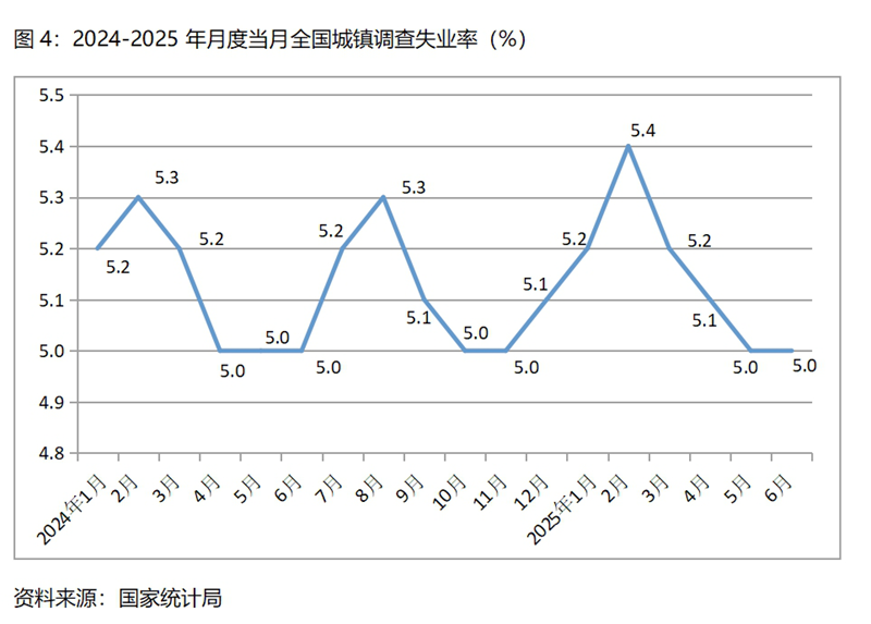 (三)調(diào)查失業(yè)率比一季度下降,比上年同期上升。上半年平均調(diào)查失業(yè)率為5.2%,比一季度平均調(diào)查失業(yè)率的5.3%下降 0.1個百分點(diǎn),比上年同期的5.1%上升了0.1個百分點(diǎn)。其中,1月份為5.2%,2月份為5.4%,3月份為5.2%,4月份為5.1%,5月份為5.0%,6月份為5.0%,呈現(xiàn)出動態(tài)變化走低的態(tài)勢。