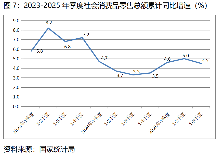 圖7:2023-2025年季度社會消費(fèi)品零售總額累計同比增速(%)