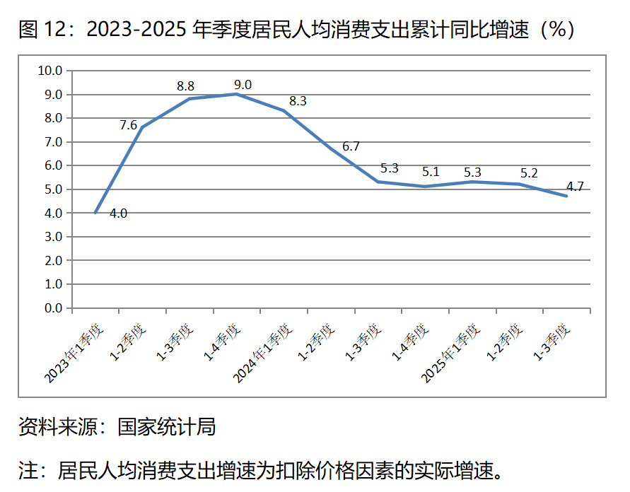 圖12:2023-2025年季度居民人均消費(fèi)支出累計同比增速(%)