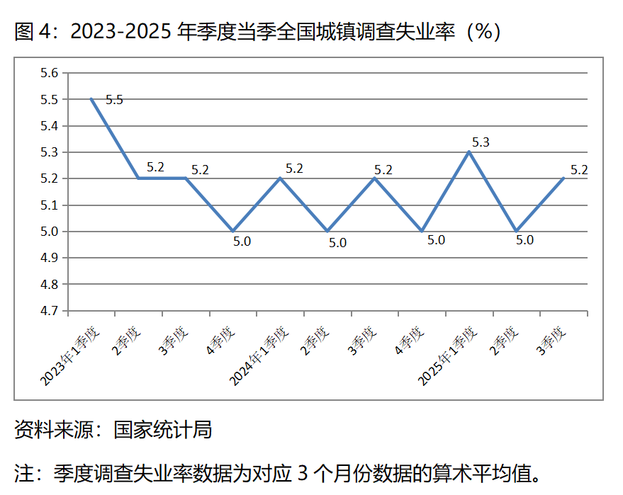 圖4:2023-2025年季度當(dāng)季全國城鎮(zhèn)調(diào)查失業(yè)率(%)