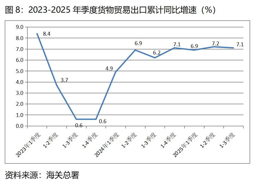 圖8:2023-2025年季度貨物貿(mào)易出口累計同比增速(%)