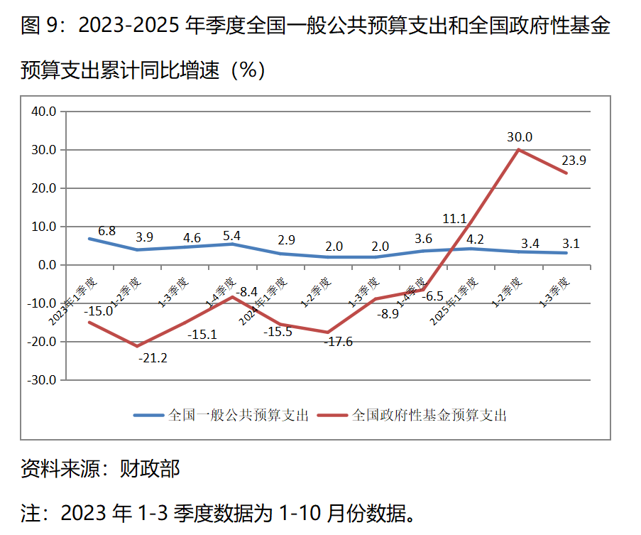 圖9:2023-2025年季度全國一般公共預(yù)算支出和全國政府性基金預(yù)算支出累計同比增速(%)