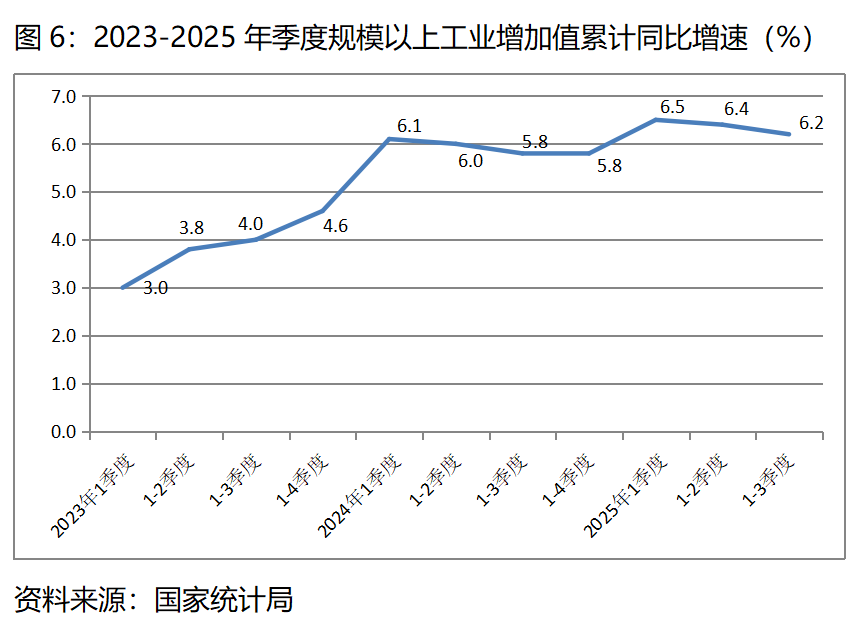 圖6:2023-2025年季度規(guī)模以上工業(yè)增加值累計同比增速(%)