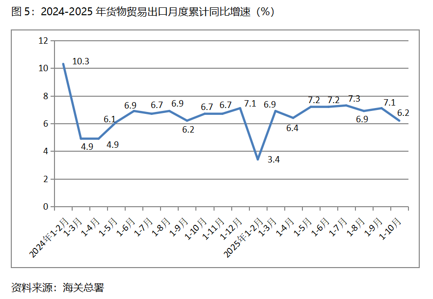五、出口增速由升轉(zhuǎn)落。1-10月份,貨物出口同比增長(zhǎng)6.2%,比1-9月份增長(zhǎng)7.1%回落0.9個(gè)百分點(diǎn),1-9月份比1-8月份增長(zhǎng)6.9%回升0.2個(gè)百分點(diǎn)。貨物出口對(duì)主要貿(mào)易出口經(jīng)濟(jì)體增速均出現(xiàn)回落,1-10月份對(duì)歐盟出口同比增長(zhǎng)8.4%,比1-9月份對(duì)歐盟出口同比增長(zhǎng)9.2%回落0.8個(gè)百分點(diǎn);對(duì)美國(guó)出口下降17.1%,比1-9月份下降16.2%擴(kuò)大0.9個(gè)百分點(diǎn);對(duì)東盟出口增長(zhǎng)15.3%,比1-9月份增長(zhǎng)15.8%回落0.5個(gè)百分點(diǎn);對(duì)拉丁美洲出口增長(zhǎng)7.3%,比1-9月份增長(zhǎng)7.8%回落0.5個(gè)百分點(diǎn);對(duì)非洲出口增長(zhǎng)27.2%,與1-9月份增長(zhǎng)29.4%回落2.2個(gè)百分點(diǎn)。盡管1-10月份出口保持了不低的增速,但10月份出現(xiàn)0.8%的下降,值得引起密切關(guān)注。