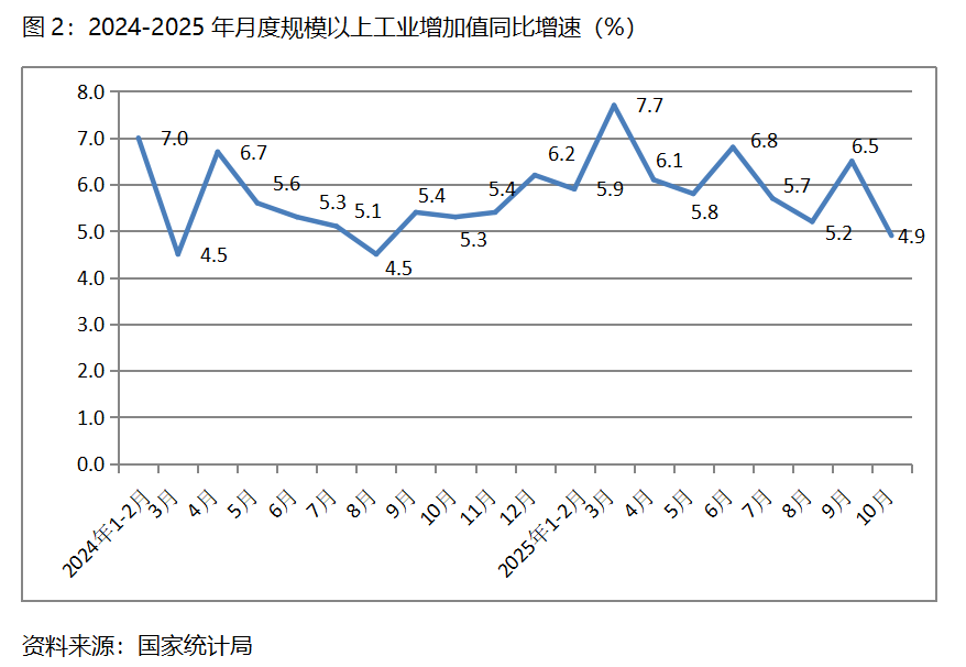 二、工業(yè)增速由升轉(zhuǎn)落。10月份,規(guī)模以上工業(yè)增加值同比增長(zhǎng)4.9%,比9月份增長(zhǎng)6.5%回落了1.6個(gè)百分點(diǎn),9月份比8月份增長(zhǎng)5.2%回升了1.3個(gè)百分點(diǎn)。從工業(yè)三大門類看,采礦業(yè)和制造業(yè)增速比上月回落,電力、熱力、燃?xì)饧八a(chǎn)和供應(yīng)業(yè)增速回升,10月份,采礦業(yè)同比增長(zhǎng)4.5%,比上月增長(zhǎng)6.4%回落1.9個(gè)百分點(diǎn);制造業(yè)增長(zhǎng)4.9%,比上月增長(zhǎng)7.3%回落2.4個(gè)百分點(diǎn);電力、熱力、燃?xì)饧八a(chǎn)和供應(yīng)業(yè)增長(zhǎng)5.4%,比上月增長(zhǎng)0.6%回升4.8個(gè)百分點(diǎn)。值得關(guān)注的是,10月份工業(yè)增速回落到了今年月份增速的最低點(diǎn)。