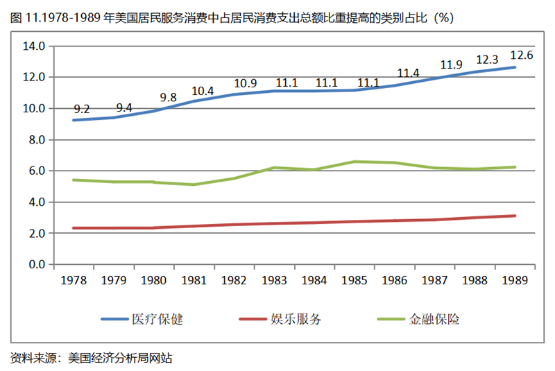由于數(shù)據(jù)來源的原因,重點(diǎn)將看一下美國居民服務(wù)消費(fèi)類別在人均GDP超過1萬美元后的變化情況。美國居民服務(wù)消費(fèi)共有7個大類別,在1978-1989年期間占居民消費(fèi)支出總額比重提高的有3個類別,分別是醫(yī)療保健、娛樂服務(wù)和金融保險,醫(yī)療保健占居民消費(fèi)支出總額的比重提高了3.4個百分點(diǎn),娛樂服務(wù)和金融保險占居民消費(fèi)支出總額的比重均提高了0.8個百分點(diǎn)。