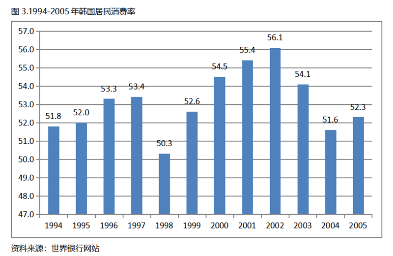 韓國是1994年人均GDP超過1萬美元的,在1994-2005年的12年期間,居民消費(fèi)率也呈現(xiàn)先升后落的走勢,總體上看是在高位上保持著較為穩(wěn)定的態(tài)勢,2005年比1994升0.5個百分點(diǎn)。