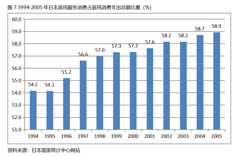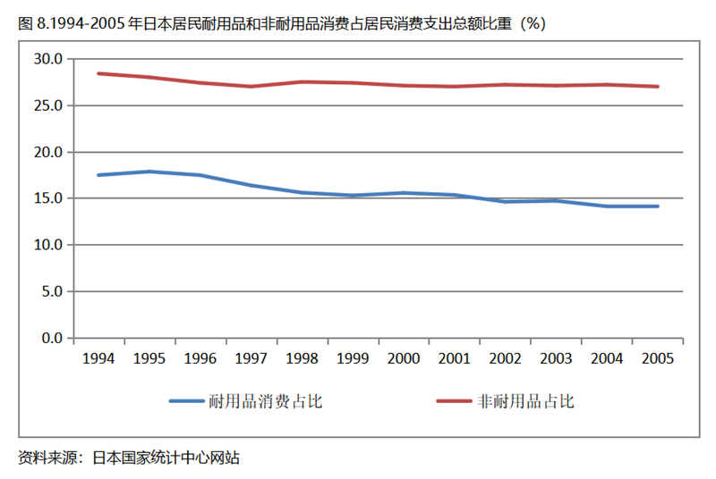 日本在人均GDP超過1萬美元后的1994-2005年期間,居民服務(wù)消費(fèi)占居民消費(fèi)支出總額持續(xù)提高,而居民耐用品消費(fèi)占居民消費(fèi)支出總額比重、非耐用品消費(fèi)占居民消費(fèi)支出總額比重均呈現(xiàn)下降趨勢。