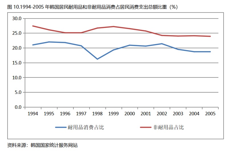 韓國在人均GDP超過1萬美元后的1994-2005年期間,居民服務(wù)消費(fèi)占居民消費(fèi)支出總額在波動中提高,而居民耐用品消費(fèi)占居民消費(fèi)支出總額比重、非耐用品消費(fèi)占居民消費(fèi)支出總額比重要均呈現(xiàn)下降趨勢。