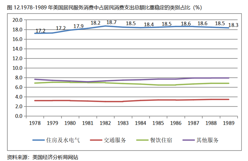 美國在人均GDP超過1萬美元后的1978-1989年期間,居民服務(wù)消費(fèi)占居民消費(fèi)支出總額持續(xù)提高,而居民耐用品消費(fèi)占居民消費(fèi)支出總額比重、非耐用品消費(fèi)占居民消費(fèi)支出總額比重均呈現(xiàn)下降趨勢。