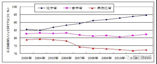 我們可以看看,從2003年到2012年這十年,實(shí)際上東北很多問(wèn)題并沒(méi)有真正解決,比如投資率、消費(fèi)率比嚴(yán)重扭曲,東北比全國(guó)要嚴(yán)重的多。三省投資率由2003年的37.3%上升至2011年的63.1%,提高了25.8個(gè)百分點(diǎn),而同期全國(guó)由41%增長(zhǎng)到48.3%,提高了7.3個(gè)百分點(diǎn);消費(fèi)率由53.2%下降至43.2%,降低10個(gè)百分點(diǎn),而同期全國(guó)由56.9%下降至49.1%,降低7.8個(gè)百分點(diǎn)。全國(guó)的投資率已經(jīng)過(guò)高了,東北的投資消費(fèi)比例更加扭曲。
