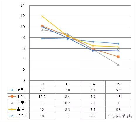 另外有一個(gè)數(shù)字,我希望經(jīng)濟(jì)學(xué)家們進(jìn)一步分析。近兩年?yáng)|北居民消費(fèi)水平增長(zhǎng)率和東北的GDP下降是反向的。遼寧是“斷崖式”的GDP下降,但居民消費(fèi)增長(zhǎng)率2012年-2015年一直高于全國(guó)平均水平。