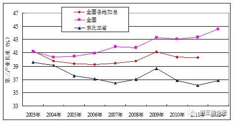 2003年到2012年,第三產(chǎn)業(yè)的比重與全國(guó)相比,東北地區(qū)差距進(jìn)一步拉大。