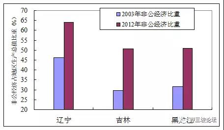 這里對(duì)民營(yíng)經(jīng)濟(jì)發(fā)展和國(guó)企改革多說(shuō)一兩句。2003年,東北國(guó)企所占的比重很高,有的省占到70%,到2012年遼、吉、黑三省非公經(jīng)濟(jì)比重分別達(dá)到64%、50.8%和51%。