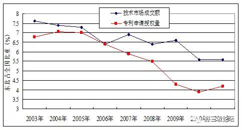 2011年,遼、吉、黑三省R&D經(jīng)費(fèi)支出分別占地區(qū)生產(chǎn)總值的1.52%、1.23%和1.02%,均低于全國(guó)1.84%的平均值,占全國(guó)比重由2003年的9.16%下降到2011年的7.1%。